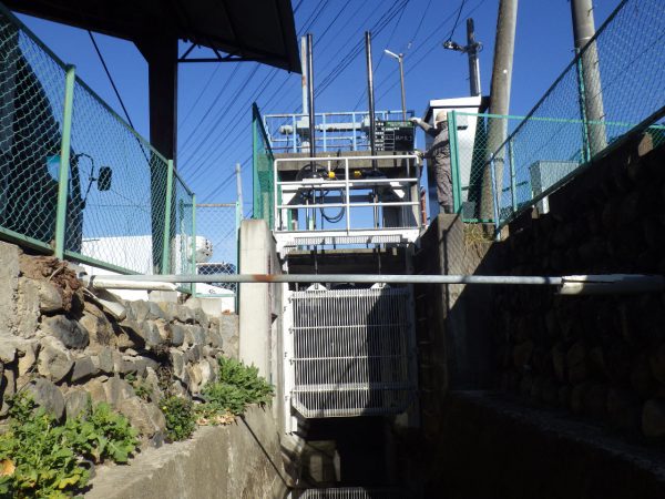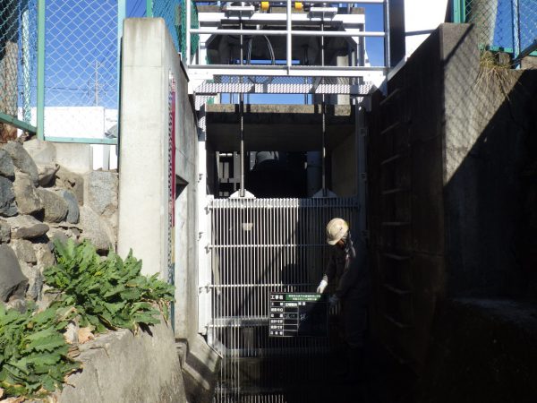 この可動式スクリーンの役割は、下流側に設置してあるポンプゲート(強制排水ができるようにポンプを取り付けた水門)にゴミが流れ込まないようにする為のものです。この水路は多くの支流が合わさり、本流に流れ込む最後の場所のため、水路が溢れそばの住宅街へ流れ込むことが度々あったそうです。その為、ポンプゲートを設置し強制排水設備を整えましたが、そのポンプゲートにゴミ等の異物が流れ込まないようにするために今回の可動スクリーンを設置しました。(今回の可動スクリーンの巻上機は手動連動式です。)