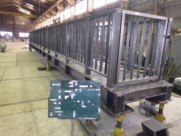 ※河川の土手からゲートの据付してある門柱の間に設置してあり、ゲートの操作や点検の際などに人が歩くのに必要な道です!この長さの管理橋を製作するのはあまり多くはありませんが、工場の広さを活かす事が出来た構造物でした。運送を考慮し、分割して製作しております。