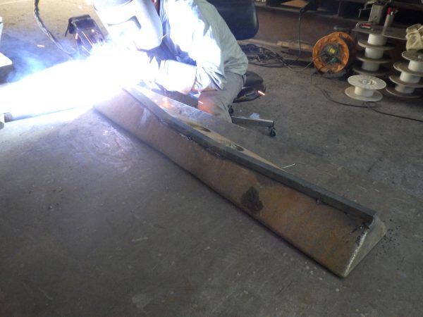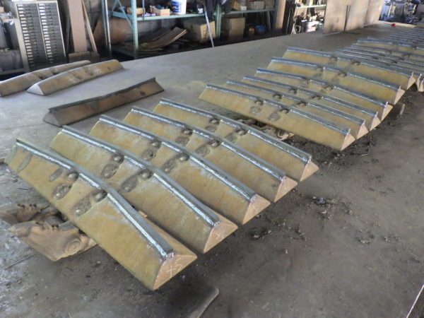 日本キャタピラー合同会社様製湿地タイプブルドーザ用キャタピラ接地部の摩耗 が激しくなったため、シュー(キャタピラに取付てある接地部1枚単位の事)にラグ材を溶接しました。今回はお客様にてキャタピラを取り外していただきましたが(予備品を装着にて機械は可動)、予備品が無い場合や休車時間を短縮させたい場合は、現場にてキャタピラを装着したままの状態でのラグ材貼りも可能です。ご相談ください。