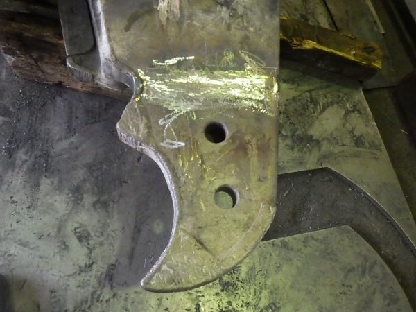 一般に薄板の溶接は難しいと言われておりますが、このような厚板は溶接を行う前に母材を十分に熱していかなければならず、同時に歪も生じるため表裏バランスよく溶接しなければなりません。それでも残ってしまう歪はプレス機やハンマーなどで傷つけない様に修正します。