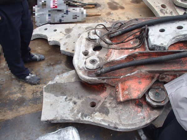 上述のコンクリートクラッシャーですが、エーティー建機様より破損してしまったとのご連絡があり、現地へお伺いしてみると圧砕箇所が中央部より折損してしまったため改修をお願いしたいとのことでした。