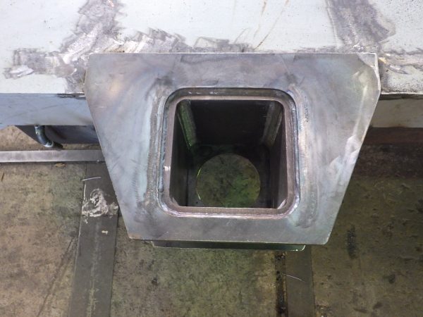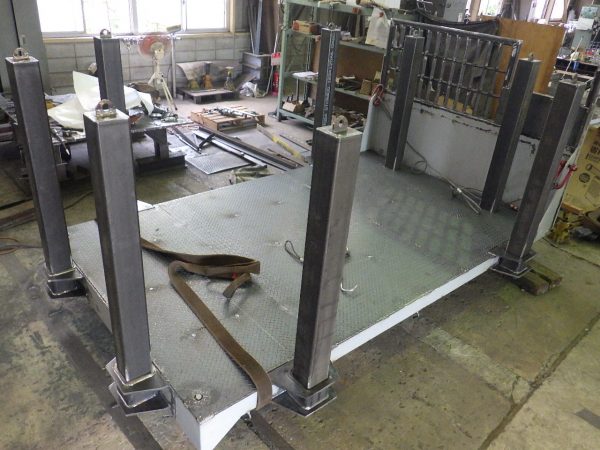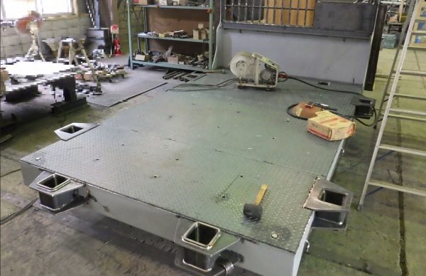 縞鋼板の随所に穴が明いておりますが、このサイズともなると四方の溶接だけでは中央部の変形や強度不足が考えられるため、明けた穴に溶接を行うことで熱伝導のバランスおよび強度を強く保つことが可能となります。もちろん溶接後にビードの凹凸が生じるためグラインダーで綺麗に均していきます。