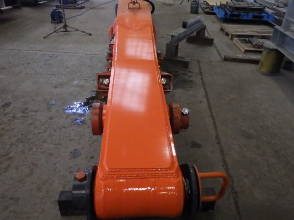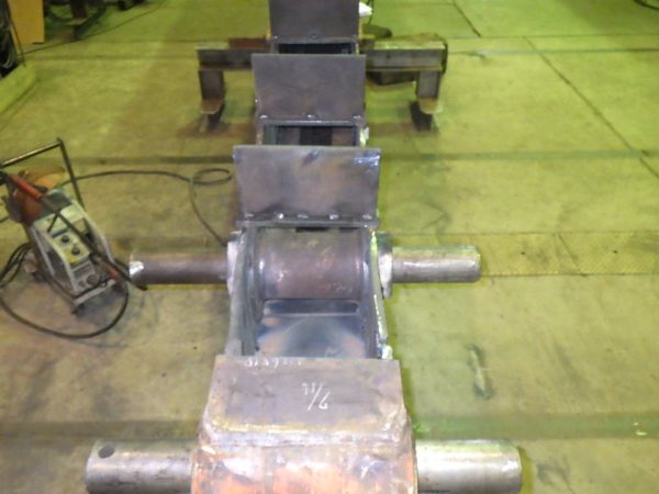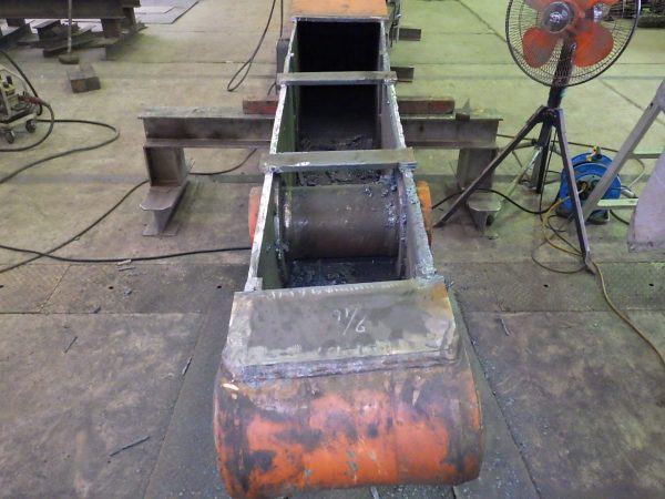 今回のアームが捻じれている箇所にはピンを2ヶ所組み込むボスがあり、互いの位置関係をずらさないまま解消していく必要がありました。そのため、本体側を炙りながら油圧ジャッキ等で広げていく方法ではなく、基礎となる土台と本体の間にクサビを打ち込みながら炙っていく手法を取りました。