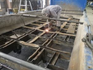 10tダンプ車のベッセル部床板が摩耗や変形の為、張替作業を行いました。 床板を剥がしたところ、縦横に入っているリブも変形しており、曲げ直しやリブの入れ替えを行い、床板に変形のしづらいスウェーデン鋼を使用して張替しました。 […]
